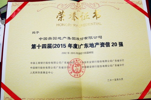 “第十四屆(2015年度)廣東地產(chǎn)資信20強(qiáng)”獎(jiǎng)狀